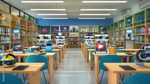 Modern Classroom with Laptops, VR Headsets, and Interactive Learning Stations – Technology-Driven Education Setup.