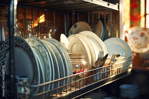 Modern, clean kitchen with an open dishwasher filled with dirty plates, cups and utensils. Household appliances that simplify everyday life and maintain hygiene.