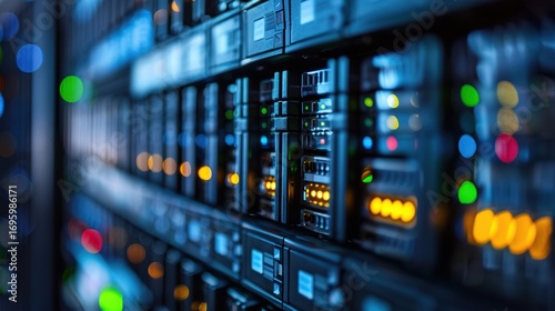 Modern Close Up of Server Rack Showing Advanced Data Storage Devices