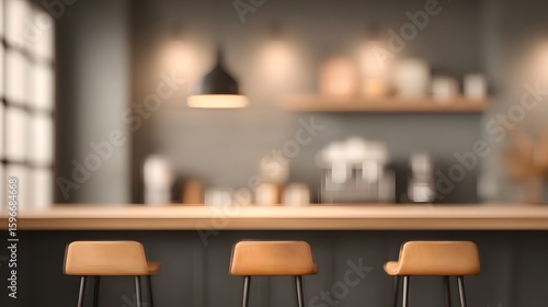 Modern coffee bar interior with industrial lights, tall stools, and exposed brick walls, blurred image, soft out-of-focus background