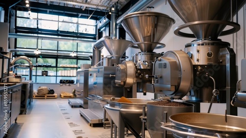 Modern coffee roasting factory, eco-friendly, immaculate, sustainable practices, high-tech equipment, energy-efficient