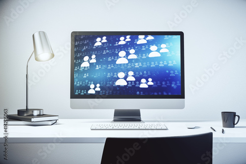 Modern computer display with social network icons concept. Networking concept. 3D Rendering