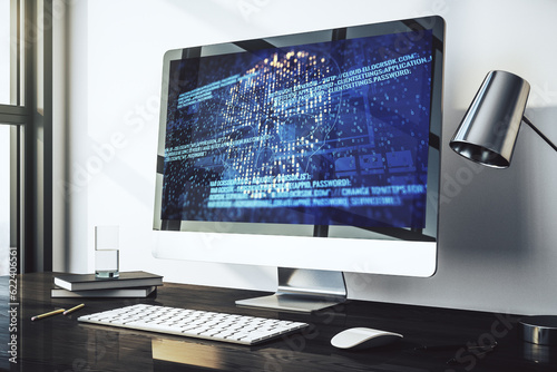 Modern computer monitor with creative code skull hologram. Malware and cyber crime concept. 3D Rendering