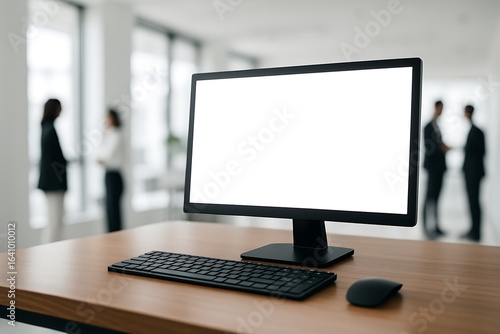 Modern computer screen keyboard mouse on wooden desk with blurred people image