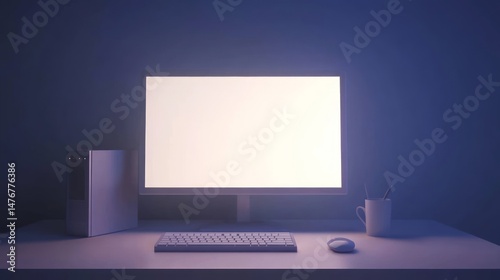Modern Computer Setup on a White Desk at Night with Purple Ambient Lighting
