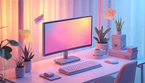 Modern Computer Workspace with Pastel Lighting and Potted Plants in Cozy Home Office
