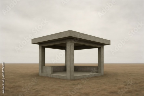Modern concrete pavilion standing alone in a desolate, empty landscape under a cloudy sky, evoking a sense of solitude and minimalism