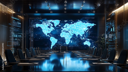 modern conference room with large digital world map display creates futuristic atmosphere. room is equipped with sleek furniture and advanced technology, ideal for global meetings