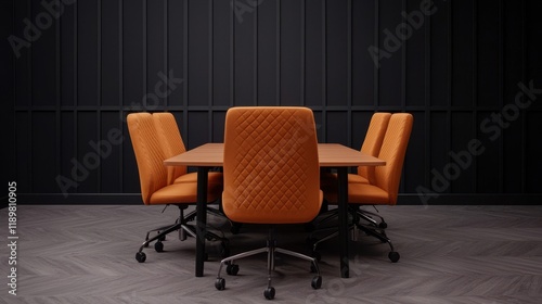 Modern Conference Room with Orange Chairs and Dark Wall Design