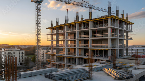 Modern construction site with crane and unfinished building against a vibrant sunset sky, showcasing progress and urban development.