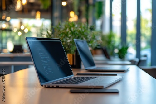 Modern corporate office workspace with laptops on table, ideal for productive work environment