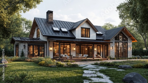 Modern country house with large windows in serene nature setting