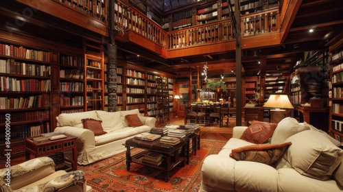 Modern Cozy Home Library: Inspiring Space with Extensive Book Collection and Relaxing Seating Area