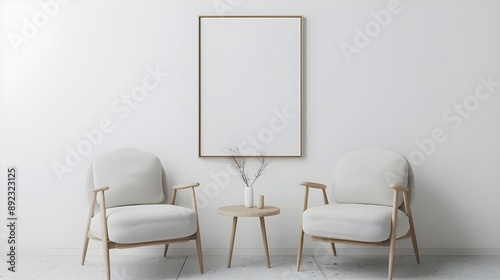 Modern cozy mock up and decoration furniture of living room and empty canvas frame on the white wall texture background, 3D rendering