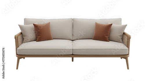 Modern cozy sofa with soft cushions, minimal design, Isolated on white and transparent background