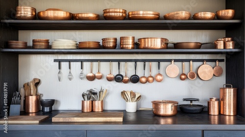 Modern Culinary Kitchen with Copper Cookware and Utensils Display