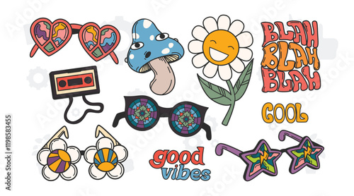 Modern Cute 80s-90s Retro Girl Power Isolated Fashion Cartoon Illustration Set Suitable for Badges, Pins, Sticker, Patches, Fabric, Denim, Embroidery and Other Girly Related Purpose