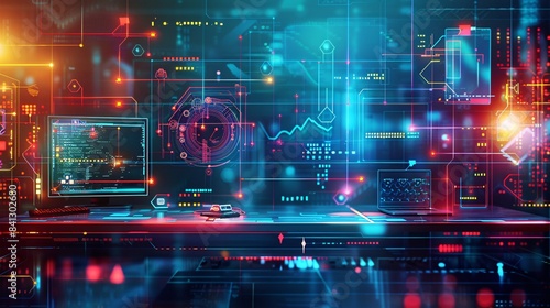 Modern cyberpunk office interior with vibrant neon lighting and IT elements, background blurred
