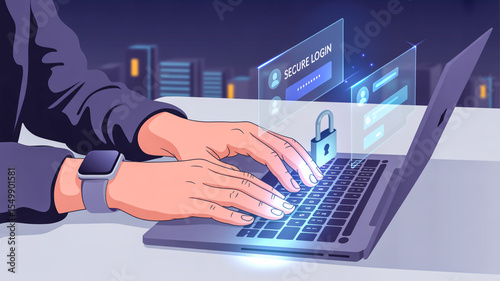 Modern Cybersecurity Scene Hands on Keyboard with Blue-Tinted Holograms, Smartwatch, and Prominent White Padlock Symbol