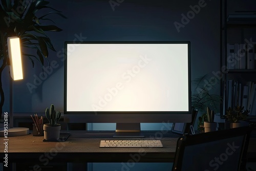 Modern Dark Office Studio with Desktop Computer Mockup on Table Workspace at Night 3D Render