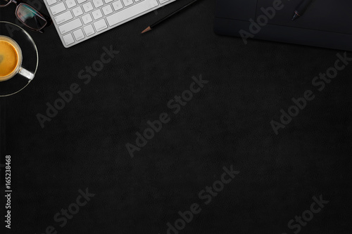 Modern dark surface office desk table with computer, office supplies and cup of coffee.