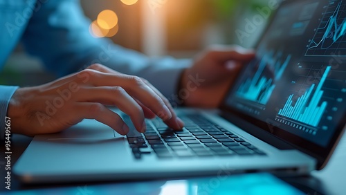 Modern data analysis with digital interface on laptop, showcasing business analytics, charts, and graphs. Perfect for technology, business, and data-driven content.