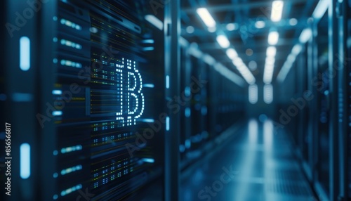 Modern data center corridor with futuristic server racks and glowing network connections illustrating advanced blockchain technology.