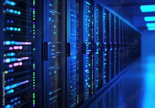 Modern data center corridor with illuminated server racks and blinking lights, ideal for technology presentations, cybersecurity content, and cloud computing themes