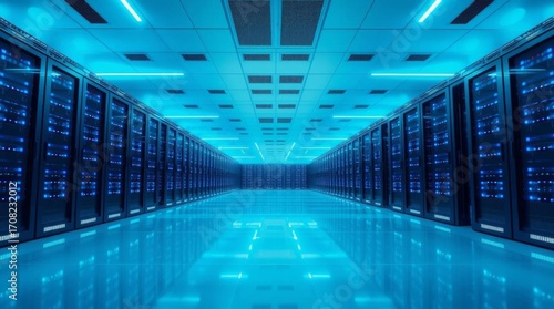 Modern Data Center Interior Server Racks, Blue LEDs, and Reflective Floor