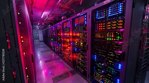 Modern data center interior with vibrant neon pink and blue lighting illuminating rows of server racks, perfect for technology, cybersecurity and digital infrastructure concepts.
