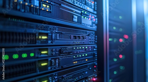 Modern Data Center Server Racks Illuminated in Blue Light Technology
