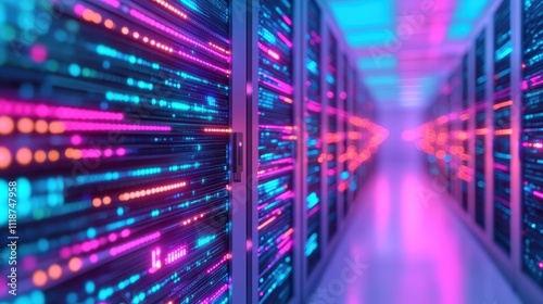 Modern Data Center Server Room with Neon Lights Futuristic Technology Big Data Cloud Computing Artificial Intelligence Information Technology Network Infrastructure Data Storage Cyber Security