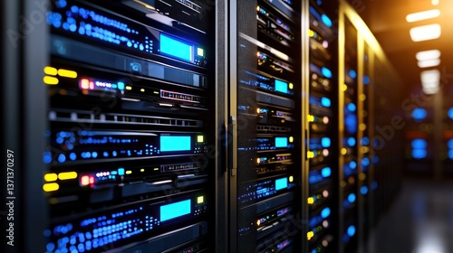 Modern data center showcasing rows of servers with illuminated panels, highlighting technology