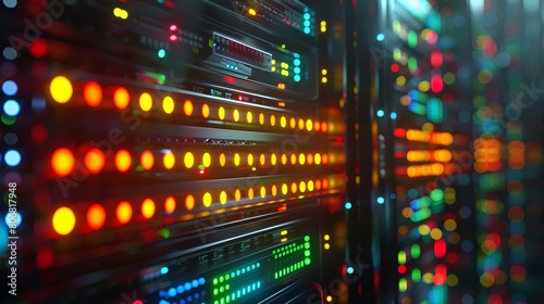 Modern Data Center with Network Servers and Lights,Interior of a modern data center with rows of high-capacity network servers illuminated by multicolored LED lights.