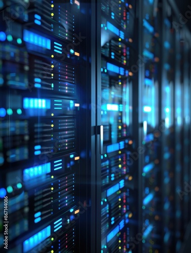 Modern data center with rows of network servers and blue LED lights, highlighting cloud computing and information technology infrastructure.