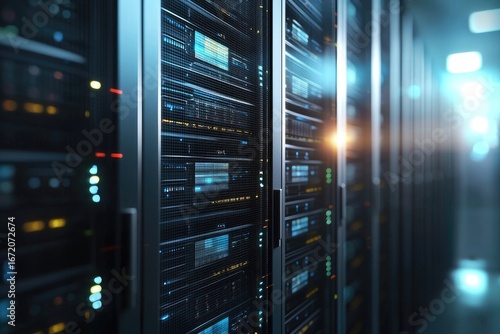 Modern data center with server racks lit by blue and orange lights for cloud technology, secure storage, and network infrastructure, perfect for IT, digital business, and cyber visuals