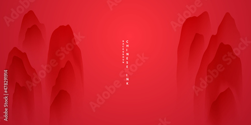 Modern design vector illustration of gorgeous Chinese ink landscape painting on red background.