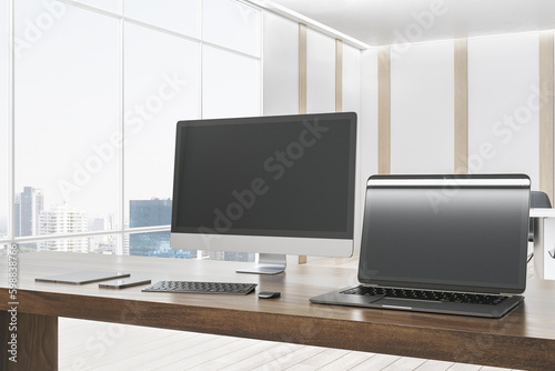 Modern designer office desktop with empty mock up computer screens, supplies and blurry interior with windows and city view background. 3D Rendering.