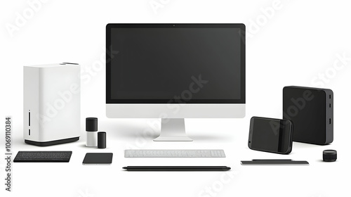 Modern desktop computer setup with monitor, keyboard, mouse, and accessories.