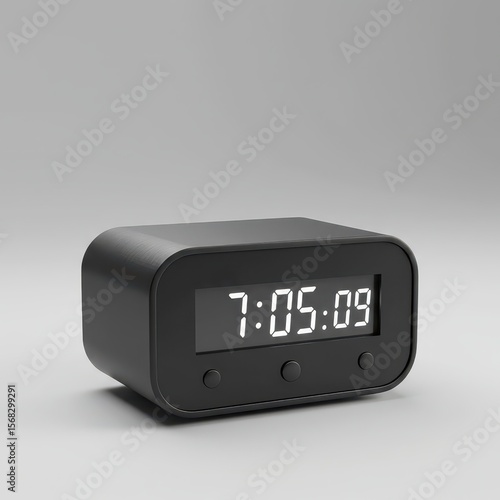 Modern digital alarm clock with LED time display on gray background, minimalist electronic timekeeping device, bedside wake-up tool