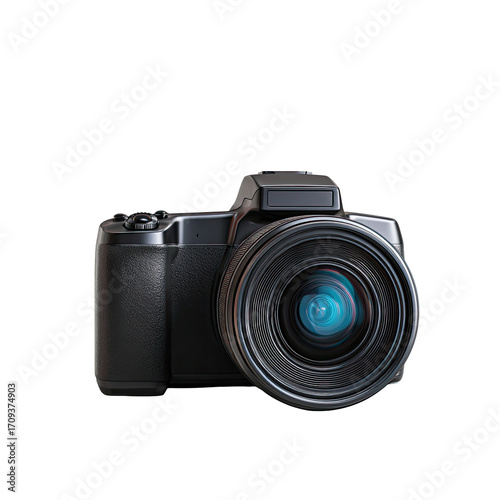 Modern digital camera, dark gray, front view
