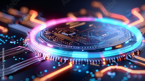Modern digital circuit patterns in bold neon colors, ideal for technology-themed presentations and ads. Illustration, Image, , Minimalism,