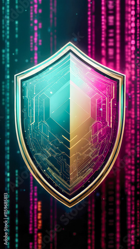 Modern digital shield design with glowing effects and binary code backdrop creates a high-tech security visual