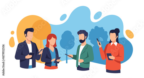 Modern diverse group using smartphones and tablets for digital communication and connectivity in an abstract outdoor setting. Perfect for technology and lifestyle.
