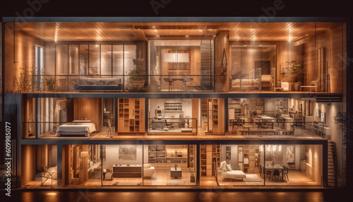 Modern domestic kitchen design with wood material and elegant lighting equipment generated by AI