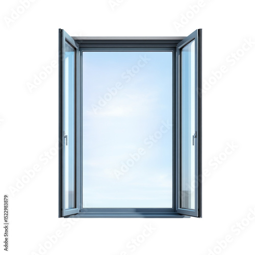 Modern double window with open casements revealing bright sky and soft clouds, transparent background, cutout PNG