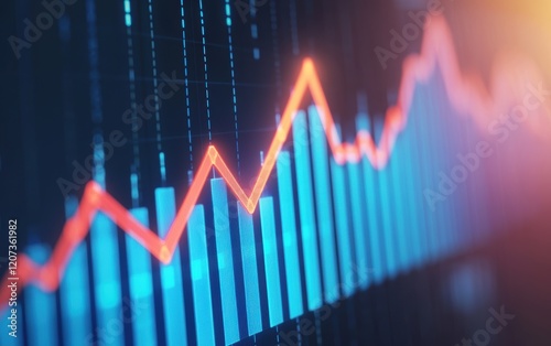Modern economic concept featuring ascending blue bar charts and a dynamic red arrow pointing upward, highlighting market trends