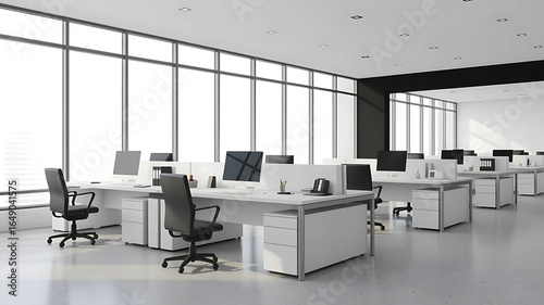 Modern empty office space with large windows and rows of desks and chairs