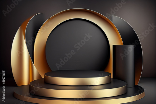Modern empty round podium or stage mockup for product photos with golden and black elements made with Generative AI