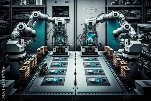 Modern factory using artificial intelligence robots and innovative technology, AI futuristic industry concept, AI generated